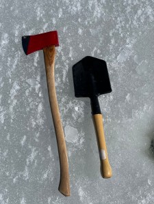 After parking, throwing on our packs loaded with fishing gear, backpacking chairs, and beer we started Chiseling holes in the ice. The tools of the trade were an Axe and Shovel. The axe worked perfectly for cutting a hole in the ice and the shovel worked for getting out the big chunks of ice. From there, we tied some jig heads on our line and stuck a night crawler on the end. From there, we sat in our chairs, joked with each other, and ate way more junk food then we should have. While we landed no fish, we both missed multiple bites and others were catching fish using the same nightcrawlers.